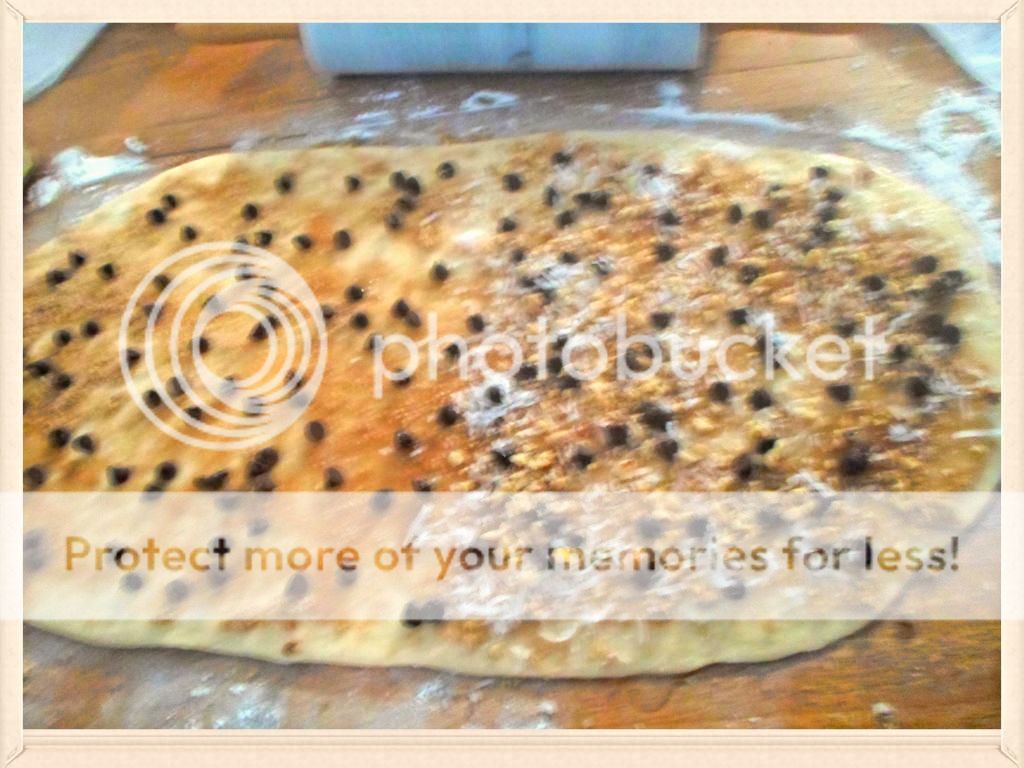 - Spread dough with 1/3 cup butter and evenly and brown sugar and cinnamon and any other toppings if you want.